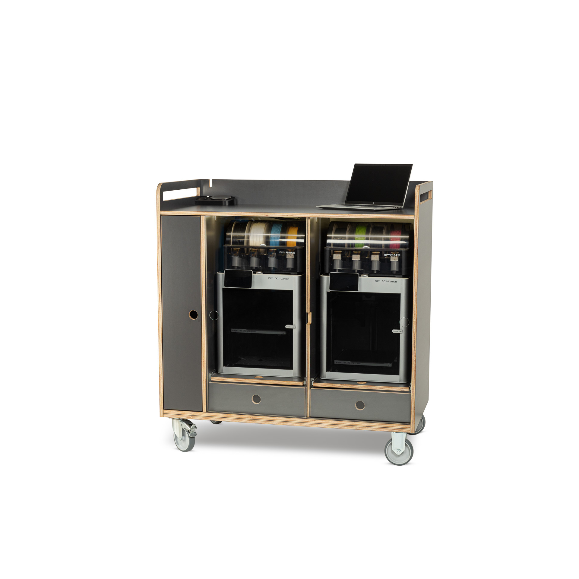 De AMcart is bij uitstek geschikt om onderdak te bieden aan Bambu Lab 3D-printers. Per printerpositie dient een extra uittreklade voor het opvangen van het restmateriaal dat vrijkomt tijdens het wisselen van filament. Dit houdt de werkplek schoon en netjes, en bespaart tijd die anders zou worden besteed